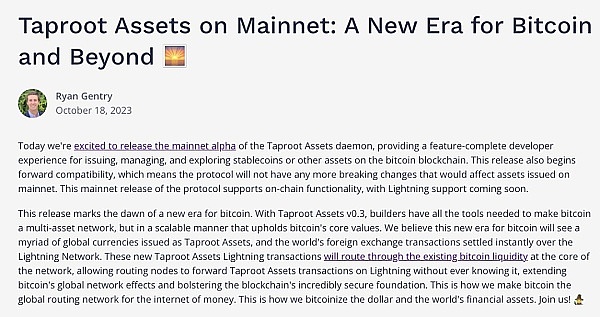 值得关注的是,Lightning Labs在10月18日发布了Taproot Assets主网的Alpha版本,这意味着开发者现在可以在比特币区块链网络上发行和管理稳定币以及其他资产。这一举措为比特币生态系统开启了新的可能性,吸引了市场的广泛关注。