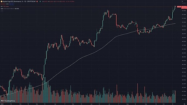 在这轮上涨中,比特币的市场份额也同步上升,并创下了今年以来的新高。与此同时,以太坊和其他大多数山寨币相对表现较弱,比特币及其相关概念代币目前主导着市场。