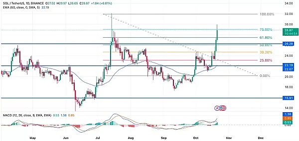SOL代币的价格已经回落至28.5美元,但仍然保持在27美元的关键阻力区域之上。下一个目标区域是32美元,如果价格能够维持在这个水平之上,可能会考验38-40美元的价格区间。如果无法维持在27.5美元的水平,可能会看到反弹趋势结束,最终导致收盘价低于25美元。
