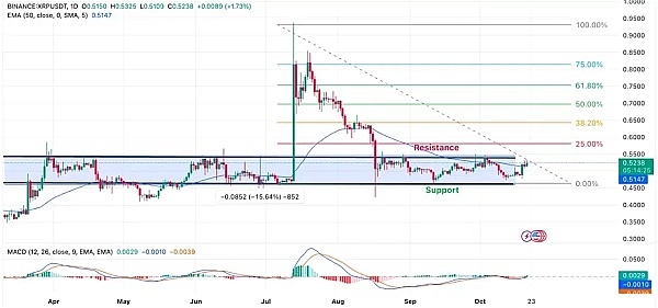 如果XRP价格能够突破0.56美元的区域,可能会达到0.66美元和0.7美元的高点。相反,如果下跌,可能的目标区域包括0.49美元和0.46美元。