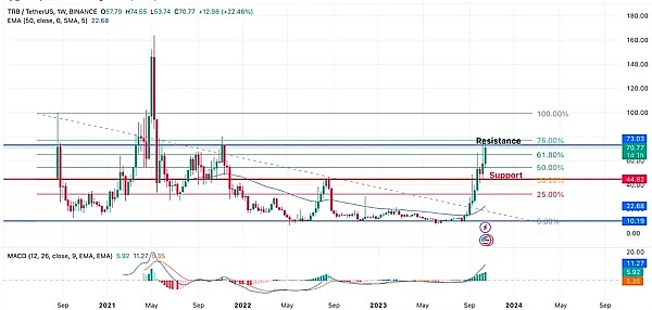 Tellor (TRB)是一种去中心化的预言机协议,被视为Chainlink的竞争对手,最近受益于人们对实际世界资产 (RWA) 领域的兴趣激增。在过去几个月里,TRB/USDT从9美元上涨到了70美元,涨幅超过600%。如果反弹势头持续,可能会测试100美元的水平。然而,在可能的逆转情况下,损失可能与盈利一样快速。44美元水平被认为是一个坚实的支撑区域,值得密切关注。