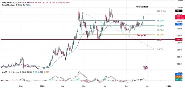 如果INJ Coin能够成功突破9.5美元的阻力区域,有可能实现两位数的价格目标。然而,如果比特币失去28,800美元的支撑,那么INJ Coin的价格也可能面临下跌至6.6美元的风险。
