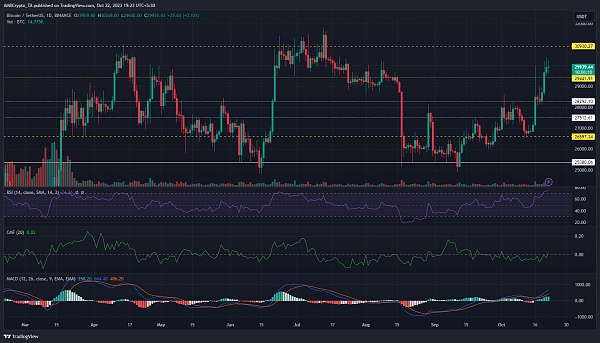 比特币在多头加大购买压力下连续上涨,突破了2.94万美元的阻力位。从10月15日开始的看涨反弹使得比特币上涨11.4%,从2.68万美元上涨至2.99万美元。