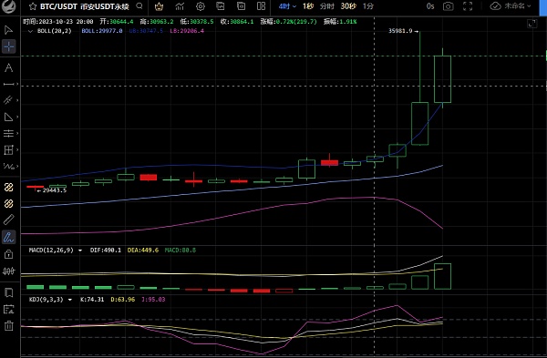 四小时技术结构上来看,布林带依旧呈现开口向上行运行,行情目前运行在布林带上轨,MACD多头量能柱持续放量,KDJ指标三线走出平行向上,空头较为乏力,早间一波插针拉至36000附近,下方支撑依旧十分稳固,走势结构上在高位居高不下,说明整体走势也是偏向多头,所以这种强势节奏下建议回踩低多为主高空为辅。