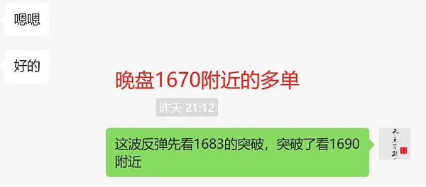 昨天长路在文中和视频中给出空单策略及下方1670附近的多单,跟上操作的朋友,多空都有收获,今天早间的多头,正在休息,有学员做多拿到不菲的收益,恭喜。