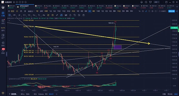 上个交易日以太坊强势老师反弹1705附近承压回落1660附近重新上行,受到SEC备案ETF利好消息的影响,今天早间测试1805附近高点回踩,走出了一大波行情,值得注意的是比特币也同样走出了34000的高点。