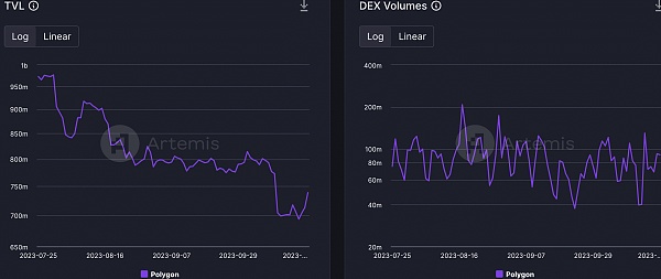然而,Polygon 上的 DeFi 领域却呈现出不太乐观的景象。根据Artemis的数据,协议中的总锁定价值(TVL)出现了大幅下降。此外,Polygon 网络上的去中心化交易所(DEX)交易量仍然停滞不前,表明缺乏实质性活动。
