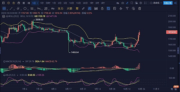 10月24日以太坊(ETH)合约技术面分析:以太坊ETH走势结构上看,大周期日线级别昨日报收大阳线,K线形态上连阳上涨,价格同样运行于均线上方,且已经偏离了均线支撑位置,布林带又继续开口欲望;附图指标金叉运行,在大趋势上明显强势上涨,而在低多交易的思路当中还是需要注意回撤修正的风险,这也是市场情绪规律,不要过于自信了,稳当一些总是对的;短周期小时图凌晨上涨今日早间延续强势破位前一日高点,修正的低点位置在1750区域,同样这个价格回调比较难以到位。而价格回归均线支撑位置在1795区域附近。因此今日ETH短线合约交易策略:回撤1795-1800区域多,止损1781区域,目标看1835-1850区域;
