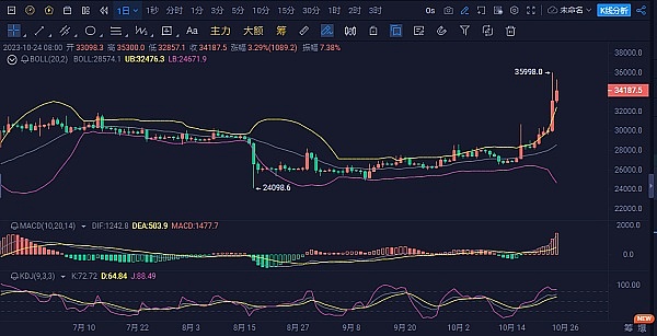 10月24日比特币(BTC)合约技术面分析:BTC走势结构上看,大周期日线级别昨日报收大阳线,K线形态连阳,价格运行均线上方,且有偏离均线加速的迹象。附图指标金叉放量运行,整体走势上涨强势且明显。所以不能盲目逆势交易;当前需要注意的是价格回撤修正的风险问题,关注回撤的力度和支撑才能找到合适的交易机会;所以再小周期的回撤上看60分钟走势结构图来看,隔夜价格处于慢涨走势,今日早盘开启暴力上涨走势,K线形态连阳,附图指标二次金叉放量运行,这就表明上涨很强势,但是上涨的空间很大,时间却很短,所以短时间再次颇高是需要积蓄能量和资本的,所以需要关注回撤走势再进场。价格上看修正的低点在32600区域,价差太大了,修正走势很难到位,那么就应该继续关注更小周期支撑34000和32600。因此今日BTC短线合约交易策略:回撤 33750多单进场,止损33300区域,目标看34200-34600-35300区域;