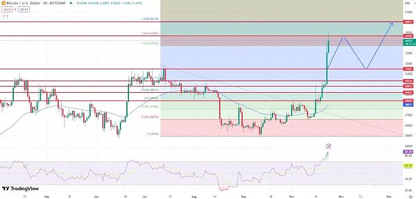 比特币的短期趋势向上,但需突破34,700美元的阻力位,如果未能突破可能暗示看跌修正。如果比特币保持势头并成功突破34,700美元,可能会挑战更高水平。