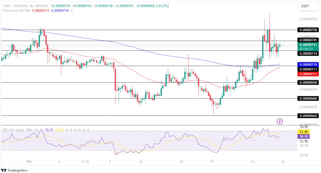 随着市场的上涨,SHIB 价格经历了巨大的动力并突破了它。此外,价格继续上涨,但在 0.00000758 美元处被拒绝,此后价格失去动力,目前交易接近其支撑位 0.00000734 美元。