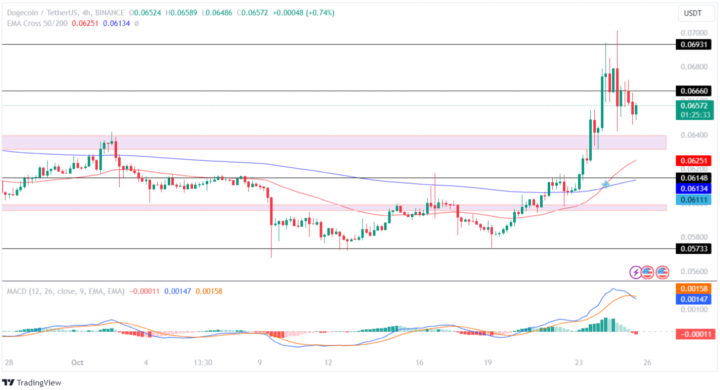 狗狗币突破关键阻力位0.06660美元并继续上涨,但多次在0.6931美元处遭到拒绝,随后失去动力并跌破了0.0660美元的支撑位。