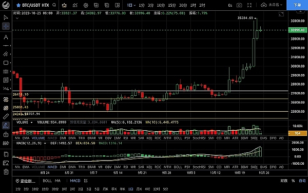 根据最新的走势分析,比特币昨日整体走势和之前的预测一致。在早间拉升了4000美金之后,随后又砸下了3000美金,但是在33250附近找到了支撑并出现反弹。对于跟上昨日思路的朋友来说,空单获利1300点。目前币价在34040附近运行,四小时级别MACD多头逐步缩量快线拐头,MA7均线走平,虽然有回调但是没有跌破MA7均线。综合来看,行情处于震荡修复阶段,日线级别多头逐步放量。若上攻不能突破高点,可以考虑进入空头策略,一旦突破可看到35500-36000的目标区间。短期虽然偏向多头,但是由于处于高位,不建议追多。思路建议逢高做空为主,低多为辅。上方压制区间在34500-35500,下方支撑区间在33300-32500。