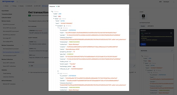 用户可以通过 Transactions API 获取任意 NFT 资产完整的交易记录、行为及当前所有权信息,实现对 NFT 的全面跟踪,为开发者分析 NFT 的交易特征、价格走势、流转路径等提供了全面可靠的数据来源。