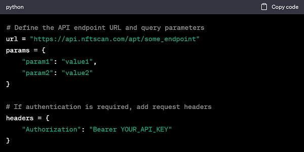 开发者在 NFTScan 的 API 文档中找到所需的 Aptos API 接口和参数后,可以按照以下简要通用步骤使用 Python 编写 API 请求代码: