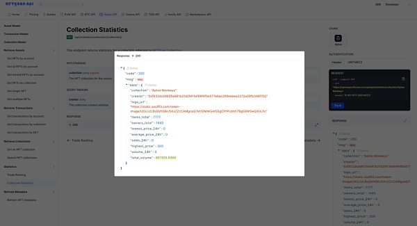 该接口主要返回 Aptos 网络上一个 NFT Collection 的概览数据分析,主要包括项目名称、logo、item 总数、持有者总数、24h 最低价、24h 平均价、24h Sales、历史最高价、24h 交易额、历史总交易额等详情信息。这里我们查询的是 Aptos Monkeys 的数据信息: