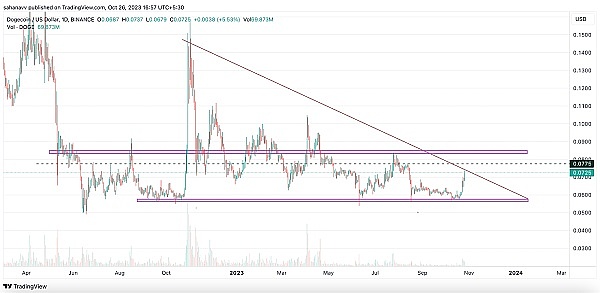 狗狗币价格上涨,突破下方支撑位
