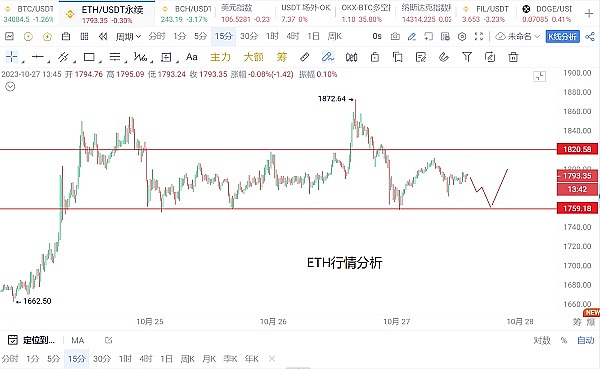 比特币(BTC)的走势相对坚挺,价格波动率不是很大。目前在35000附近回落,下方支撑在33500附近。箱体区间震荡尚未突破,因此我们的思路仍然是看高空低多。在15分钟级别上,目前受压于MA240均线,并预计还会回踩到MA450均线附近。因此,在晚盘前我们可以先观察一波回踩行情。技术指标方面,KDJ缓慢粘合,MACD指标仍然处于死叉形态,整体走势偏空。建议在34100附近空,目标看向下500点。