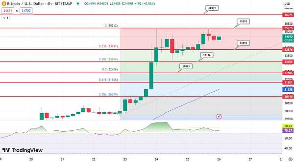 当前比特币/美元货币对的价格为34,472美元,反映出金融市场上的看涨和看跌情绪的变化。枢轴点稳定在33,894美元,是交易者的关键指标之一。