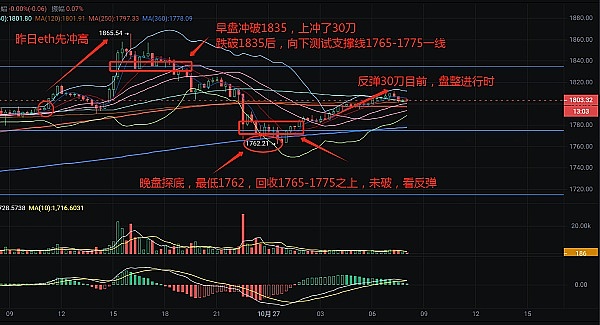 昨日ETH表现强于BTC,显示出主力资金转战的意向,接下来我们可以将ETH作为重点关注对象,大饼则可作为辅助。