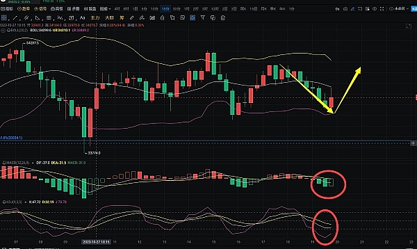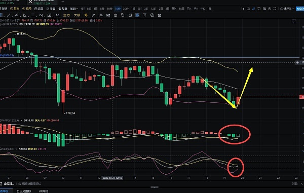 早间洪伟给出策略反弹空完美止盈,下午行情一直在试探下方支撑点位,但是始终未能突破,看15分钟线,BOLL轨道缩口向下,MACD形成死叉但是已经呈现拐头向上的趋势,KDJ处在超卖区,有上升空间,结合数据来看,晚间行情操作还是建议做多。
