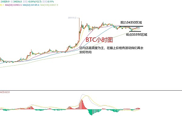 今日方面,大周期日线级别昨日报收小阴线,K线形态上连阳单阴,附图指标金叉运行;而昨日收阴当前来说也只是看作修正的一种,毕竟时间是在周末,加上整体波动不大,价格也没有向下破位企稳,送一当前大趋势上还是上涨明显优势的;短周期小时图还是没有变化,价格还是区间之内震荡,虽说昨日价格探底是破了前一日的低点,但随后的反抽基本抹平跌幅,今日又是周末,当前价格还是在高位盘整,那么操作就要等机会了,先关注高点34350区域阻力,低点33350支撑,操作交易肯定是要等到晚上去了,日内大家稍安勿躁。