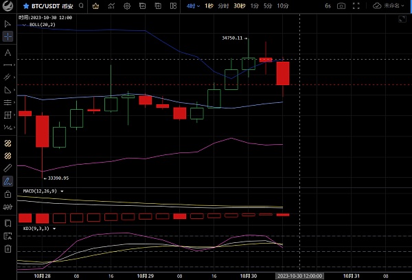 昨日行情持续箱体震荡,直至今日凌晨行情插针上探最高来到了34700附近,但是并未企稳,今日早间开始一路下行,目前行情在34200附近震荡修复运行中。