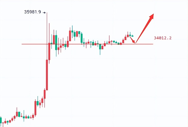 比特币周线收取两连阳确认多头趋势,下一步需要确认多头上涨趋势的情况下,价格一定会去38000附近去试探,否则周线难以延续。日线上情况客观高位横盘震荡已经,虽然有明显的多头量能收缩,但这并不影响下一次的上涨冲击,KDJ多次在70附近支撑粘合,均线支撑已经来到34100一线,四小时是上价格整体保持在一个boll上涨通道之中,支撑在34120,macd空头量能完全收缩,后续多头随时多有发力的可能,KDJ三线在60附近会有粘合,当KD二线支撑J值继续上行的时候,K线价格也会随着上涨,一小时上K线价格整体压制在34800下方,底部地点在不断的上移,后续还有力量会尝试突破34800整体压制。综合上述比特币日内建议做多为主。