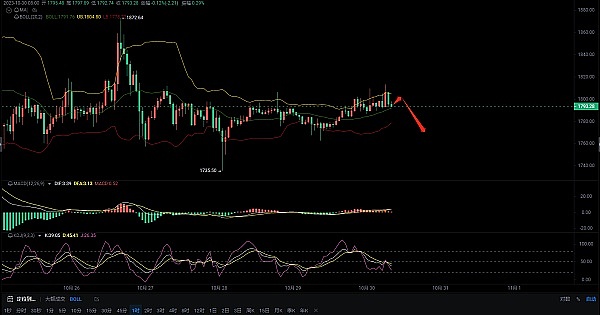 币价小幅拉升后回调目前运行上轨下方。MACD双线粘合。KDJ呈向下趋势。根据东哥的建议,建议空单为主。
