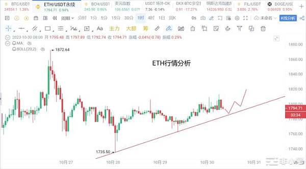 ETH:以太晚间宽幅震荡,低点在逐渐上升,高点有突破迹象,1800点不断向上试探,小时线KDJ指标已经触底,空头下跌减弱,建议以太回踩1786附近多单,目标看1820附近。