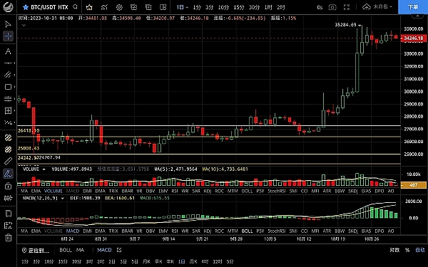 大饼整体走势如思路一致,呈区间震荡,昨日行情上攻至34850一线受阻画门回落,低位跌至34056一线,恭喜跟上昨日思路的朋友空单获利700点,目前币价在34370附近运行,四小时级别行情两次冲高受阻回落,可以看出阻力是很强的,ma均线依旧是缠绕状态,整体在区间内来回波动,幅度逐渐变窄,说明即将走出方向,目前依旧是以震荡为主,日线级别单边行情已经得到明显止步,短期形成高位震荡,ma有拐头迹象,有效跌破则会继续下行试探32500支撑,周k没能站上0.382的位置,不论后市趋势,至少这个位置存在调整预期,思路建议反弹高空为主低多为辅,上方压制34500-35000,下方支撑33600-33300