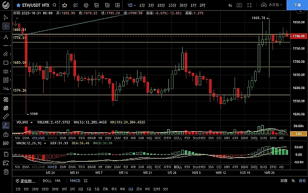 以太坊昨日多次跌至1778一线都没有破位,行情加速直线拉升,多头触及1830一线受阻回落,跌至起涨点,恭喜跟上昨日思路的朋友空单获利50点,目前币价在1797附近运行,四小时级别虽整体在ma均线上方运行但多头力度不足,行情再次回落至1800下方,macd无量双线走粘合状态,短期多空反复没有方向,日线级别再次跌至ma200支撑,关注能否收线在ma7均线下方,收在下方则跌破的概率较大,1720破位的话空单可继续持有,整体思路建议围绕高空操作低多为辅,上方压制1810-1840,下方支撑1780-1750