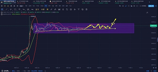 根据市场情况,建议在BTC回调至34100附近时进行多单操作,目标设定在34850附近压力位,如果突破该压力位,则目标可设定在35300。止损位建议设定在33700。