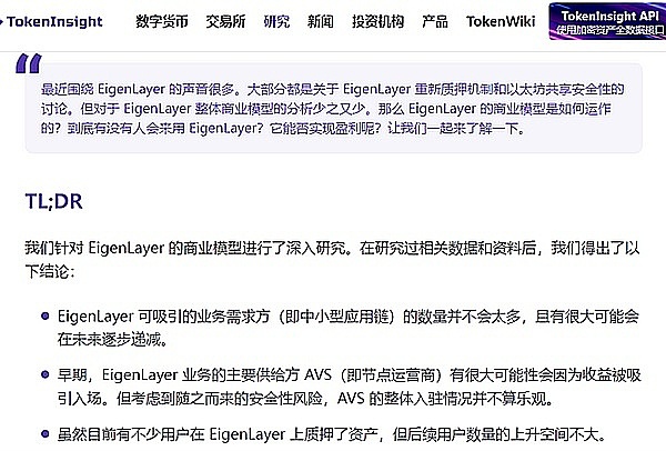 (图片来自TokenInsight的文章 — — 《Restake之王:EigenLayer的商业模型是金点子还是渣渣?》)