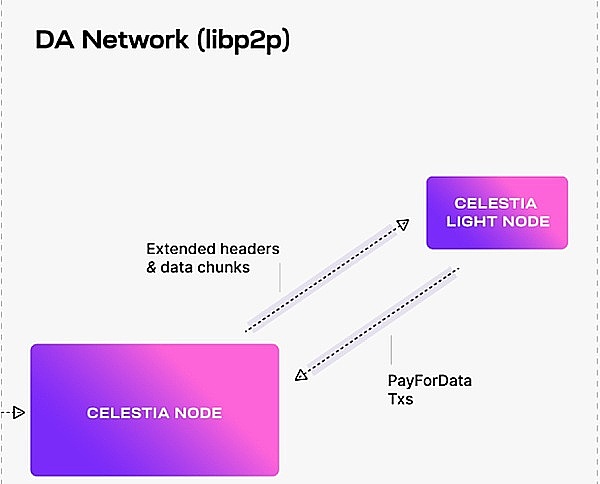 以Arbitrum Orbit为例,Orbit的排序器Sequencer可以把Layer2最新的数据发布到Celestia的区块里。然后,需要获取这部分数据的节点(比如Orbit全节点),再运行Celestia的轻节点可以,从Celestia全节点那里获取排序器发布上面的数据。
