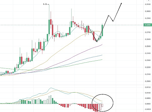 是再说下现在的一个走势, 消息公布之后币价小级别出现了加速上涨,目前4H 有低位金叉的预期 可以关注一下上方0.3 这个位置 实体突破预计还会放量上涨一波 (仅供参考,不做任何投资建议)