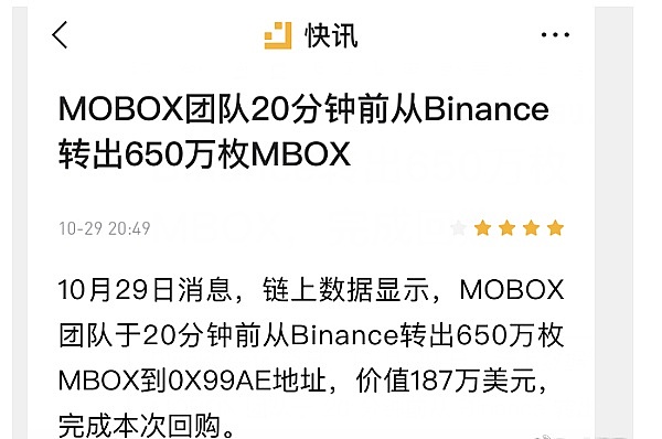 10/29日 项目方从币安转出650万枚代币 进行燃烧销毁,回购销毁等同代币的总量和流通在减少,毕竟物以稀为贵 代币少了价值自然就抬高了,毕竟现在市值在这里的,而且对于币价的一个长期发展方向也是比较有利好增幅的