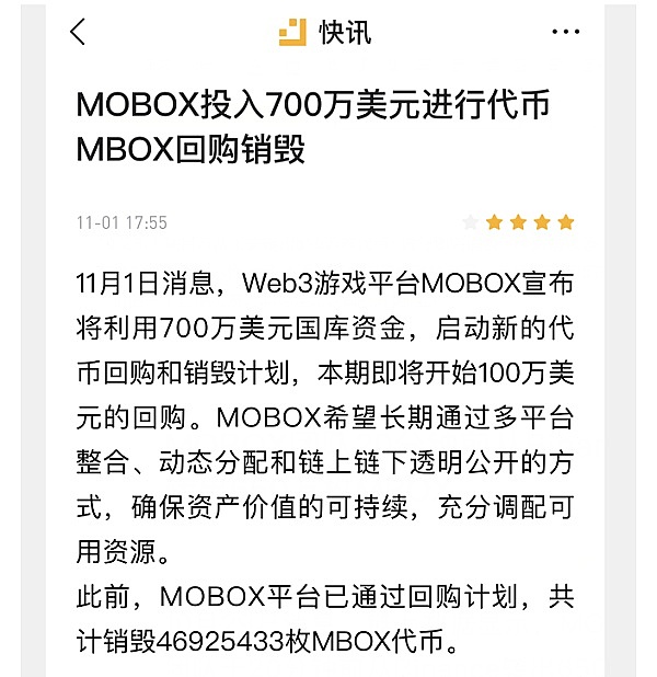 目前回购销毁还在继续,刚才发布的消息mbox 新投入了700万$ 进行代币 mbox 的回购销毁! 累计销毁已经达到了 46925433枚代币!