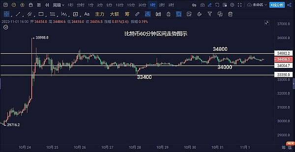11月01日比特币(BTC)合约技术面分析:BTC走势结构上看,大周期日线级别昨天报收小阳线,K线延续阴阳交替结构,k线信号显示涨跌延续性进一步减弱,行情进入到高位震荡中,并且区间正在收缩,所以延续性和出现方向性的突破就需要重点关注,行情在进入到区间走势尾端大概率十会出现破位走势的;本周整体来看周一,周二两次承压34800出现回撤走势,周二周三则是回撤34800支撑位置走出反弹局面,区间34000-34800非常的明显。短期走势上看今日凌晨比特币再次冲高34800承压,亚盘小幅回落,欧盘延续较小。所以今日美联储会议前行情依旧是看好维持这个区间波动。因此今日BTC短线合约交易策略:反弹34800区域附近直接空,止损35000上方区域,目标看34300-34000区域;回撤34000附近直接多单进场,止损33720位置,目标34600-34800