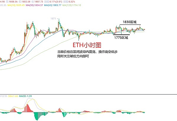 今日方面,大周期日线级别昨日报收小阳线,K线形态上连阳单阴,价格还是在高位,附图指标金叉运行,大趋势上上涨依然优势,而在短时间的走势上我们要关注的是破位的情况,当前价格维持在区间1775区域和1835区域区间内震荡,走势上还在时间修正当中,价格不动,指标跑得飞快,反复洗盘的节奏比较严重,看不到延续和力度,所以操作就简单了,在价格没有向上或者向下破位区间前,保持高空低多的思路即可;因此今日ETH短线合约交易策略:回撤1795区域多,止损1774区域,目标看1830区域,反抽1830区域空,止损1845区域,目标看1800区域;