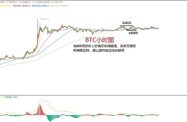 今日方面,大周期日线级别昨日报收小阳线,K线形态上连阳单阴,价格还是再高位盘整,附图指标金叉运行,基本上没有太大的变化,因为价格在震荡,不破高不破低的情况下,就是反复的洗盘节奏,而价格再区间内波动,所以需要关注的就只有破位情况的了;短周期小时图从K线形态来说明显震荡,高点34800区域,低点34000区域,从走势方面来说,当前还是在时间修正当中,价格涨跌没有幅度,指标跑得飞快,这是两个典型;因此今日BTC短线合约交易策略:回撤34200区域附近多,止损34000区域目标看34700区域,反抽34700区域空,止损34900区域,目标看34200区域;