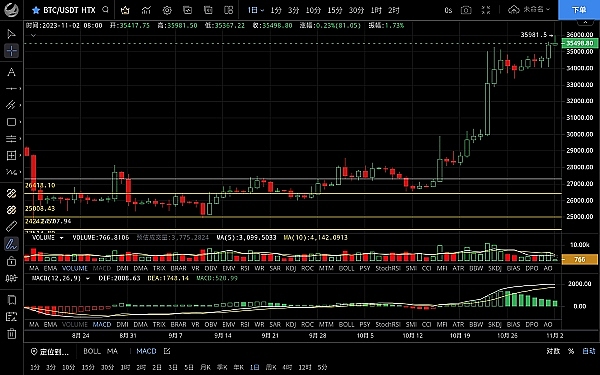 大饼昨日白盘波动不大,晚间行情冲高至35192一线迅速回落,低位跌至24066一线,恭喜跟上昨日思路的朋友空单获利1000点,目前币价在35578一线运行,四小时级别行情再次试探34000关口得以支撑,加上凌晨消息面影响,行情走出一波冲高在26000区域受阻回落,macd空头转多双线呈金叉状态,ma均线抬头,短期走势偏向多头,但力度不大且macd量能没跟上,若再次死叉将形成顶背离结构,预计会走出一波不错的回踩,目标看到32000,若跌破这个位置就不好说了,整体思路依旧是以高空为主低多为辅,上方压制36000-36800,下方支撑35000-34500
