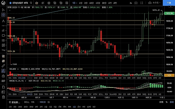以太坊昨日再次试探1780一线未破走出反弹,随后行情一路上行高位触及1874一线受阻回落,昨日空单获利40点,目前币价在1854附近运行,四小时级别行情震荡后选择继续上行,虽多头较为强势但macd量能没有跟随,短期k线收上影线,且没有有效突破1860,预计会走一波回落,日线来看空头若想行情延续必须收线在ma200下方,虽走势呈多头,但高位切勿追涨随时有砸盘风险,1720若破位空单继续持有,上方空间不大,思路建议逢高做空为主低多为辅,上方压制1880-1920,下方支撑1820-1780