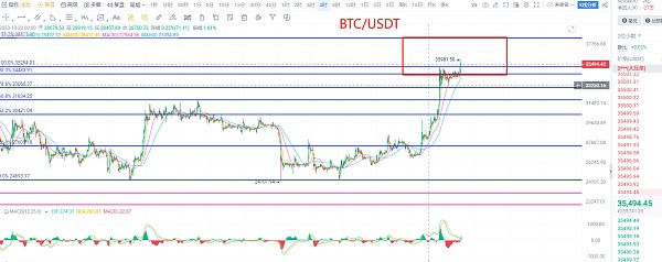 根据BTC的4小时图来看,前期顶部35300附近已经突破,但在突破之后出现了一次下跌1000点再反弹的行情。根据我们昨天的布局,当时我们提前布控到了35100这一代,行情在34000附近开始止跌反弹。方向与拐点的关键位子出现在34500这一代完成顶底转换,然后开始上攻35300。目前来看,币价已经处于35300上方运行,综合来看盘中处于多头的趋势。本轮箱体的高点结构预计会靠近38500这一代运行。