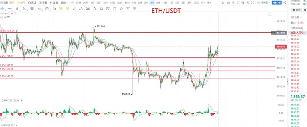 根据ETH的4小时图来看,目前处于前期触底反攻的阶段,虽然多次在回落试探,但币价依旧保持在第一箱体支撑位1770上方运行。多头再创新高1870,下一个压力点预计会上移至1900-1920这一代。根据本轮箱体的结构线来判断,上方头部的拐点预计会上升至1980-2000这一代,在做分水岭的争夺。