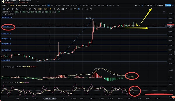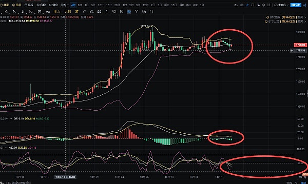 晚间洪伟给出的一波回踩做多完美止盈出局后行情又回踩到了黄金分割线的支撑位并未能突破,BOLL轨道缓张口上行,MACD有向上拐头的趋势,KDJ向下发散触及超卖区,结合数据分析,行情还是会有回踩试探支持位,但是整体操作洪伟还是偏向于回踩看多。