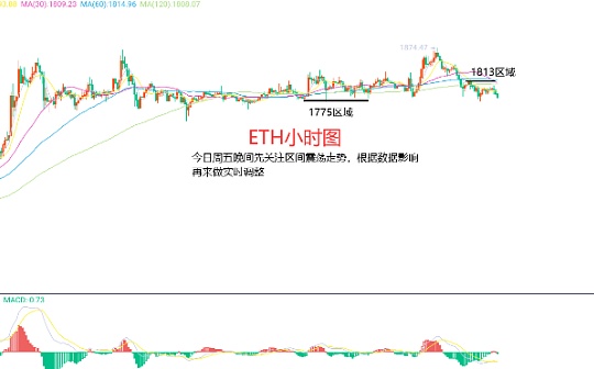 11月3日以太坊(ETH)合约技术面分析:今日方面,大周期日线级别昨日报收中阴线,K线形态上出现连阴的走势,价格运行再均线下方,附图指标金叉缩量运行,昨日的回撤力度不仅是向下破位前期的低点位置,力度大了且打断了当前上涨的整体走势,所以今日收线是关键;短周期小时图昨日美盘价格承压回撤,凌晨延续修正的高点再1813区域附近,当前K线形态连阴,附图指标死叉向下,日内是还有回撤的需求,那么需要注意的是欧盘能否支撑反弹以及数据影响;因此今日ETH短线合约交易策略:回撤1775区域多,止损1759区域,目标看1810区域,反抽1810区域空,止损1826区域,目标看1780-1775区域;