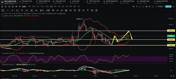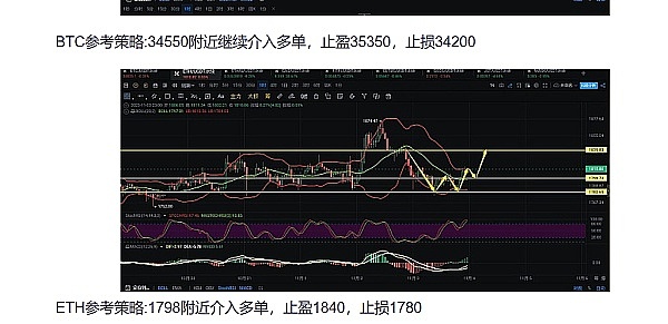 根据市场趋势分析,建议在BTC的价格达到35350时介入空单,设定止盈价为34610,止损价为35600。
