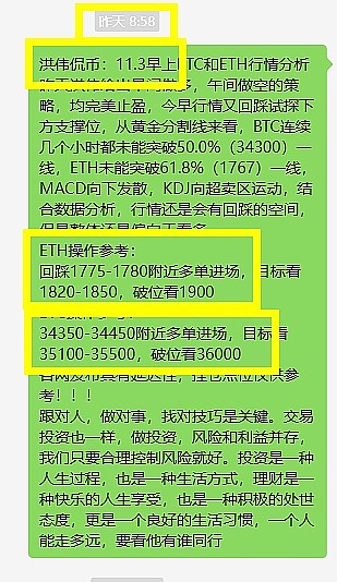 昨天早间洪伟给出大饼回踩34350附近看多,ETH回踩1775附近看多