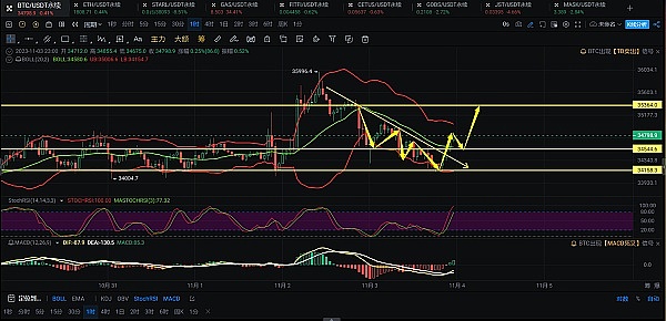BTC参考策略:34550附近继续介入多单,止盈35350,止损34200
